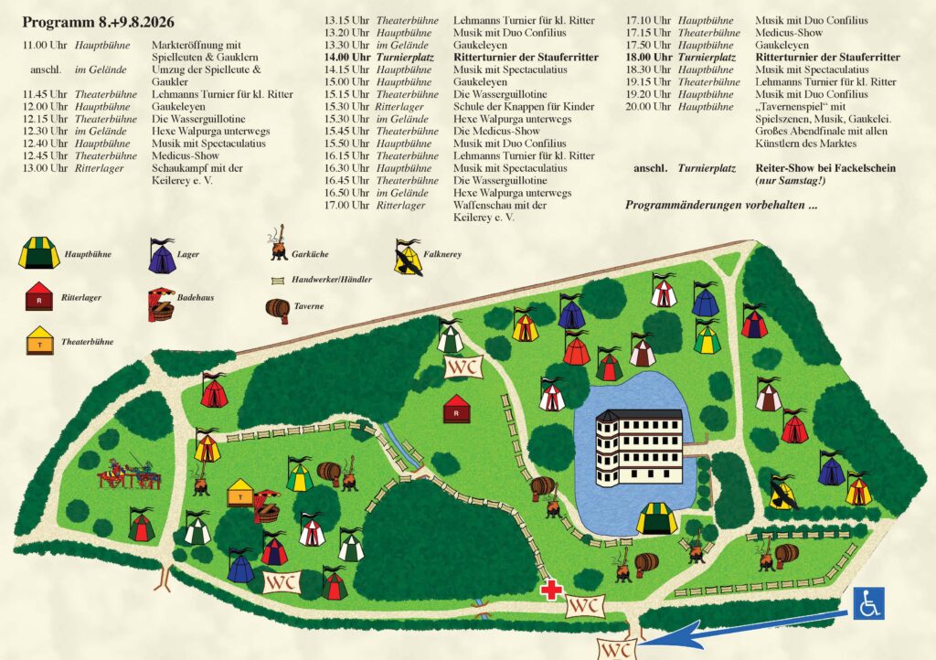 | 20.00 Uhr | „Tavernenspiel“ mit Spielszenen, Musik, Gaukelei. Großes Abendfinale mit allen Künstlern des Marktes | Hauptbühne |